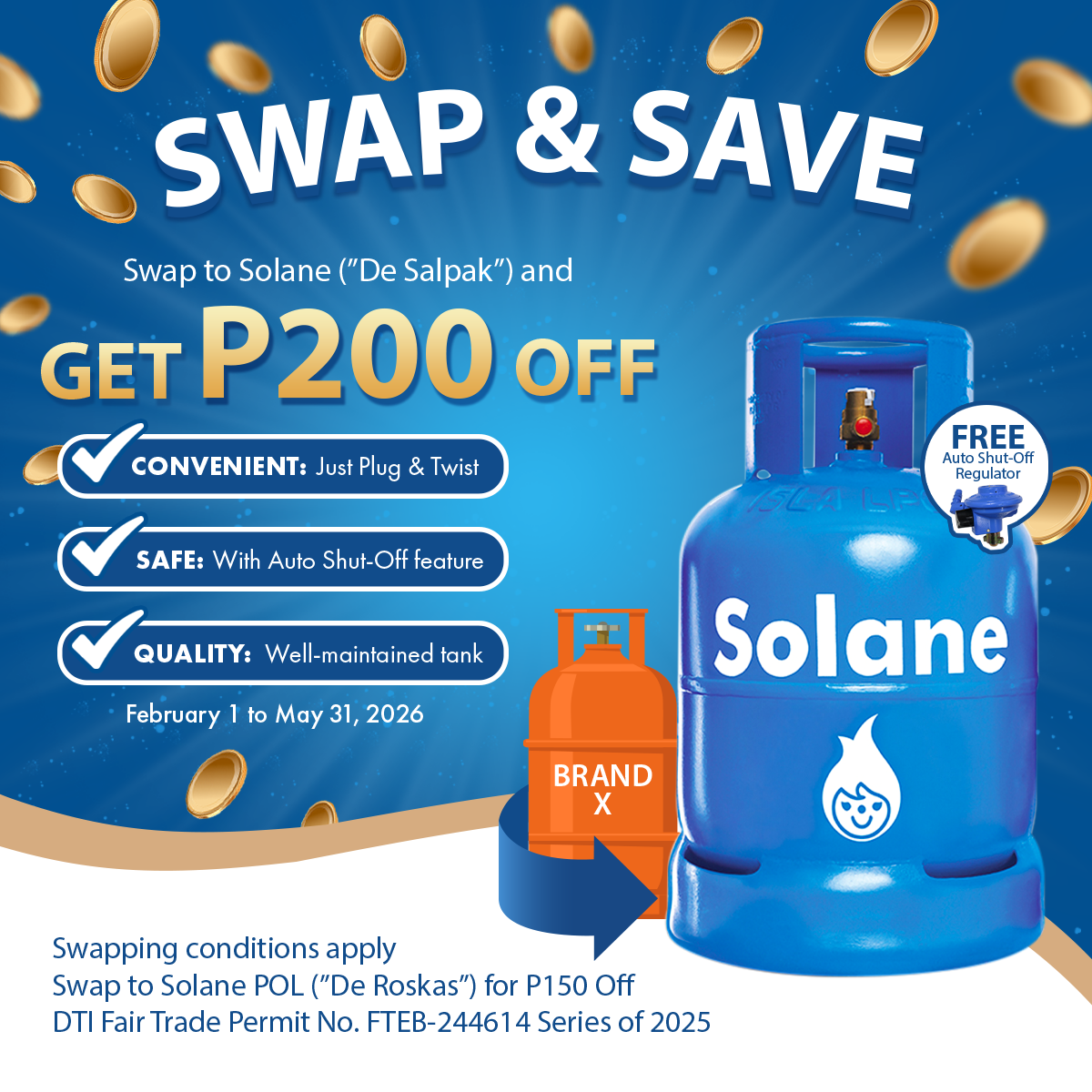 ● Customer is entitled to avail Php 500 OFF and FREE Auto Shut-off Regulator when they swap their non-Solane tank to Solane AS (de-salpak).